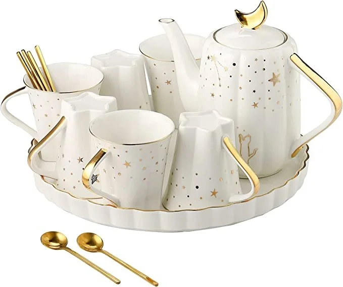 This tea set includes a teapot, cups, and saucers decorated with witchy designs, such as moons. It's the perfect addition to any cozy cottage tea party.